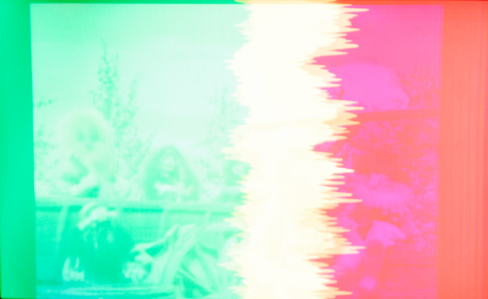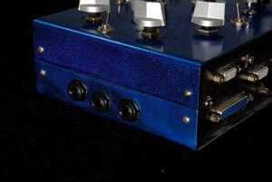 3 switched TRS-jacks on the side of the case function as effects loop inserts, one for each colour component. Effects in the form of a breakout-box may include a simple colour mixer, individual faders for each colour [see VS002], filters, or even the use of ordinary audio equipment to alter the video. The limited bandwidth of most audio gear tends strip the detail from the image and can actually make for some nice organic blobs of shape and colour. Some initial experiments routed one, two, or all three colour components through an audio mixer which was also supplying sound to the beam generators resulting in some crazy feedback loops.